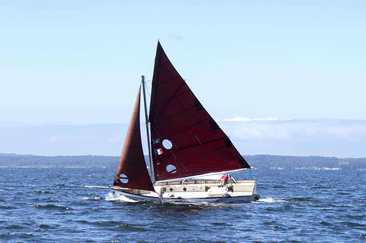Caminar vient de virer. On aperçoit Jacques tentant de trouver une position en contre-gite qui pourrait lui donner un peu plus de vitesse… Le flotteur sous le vent… flotte et donc freine quelque peu le voilier.