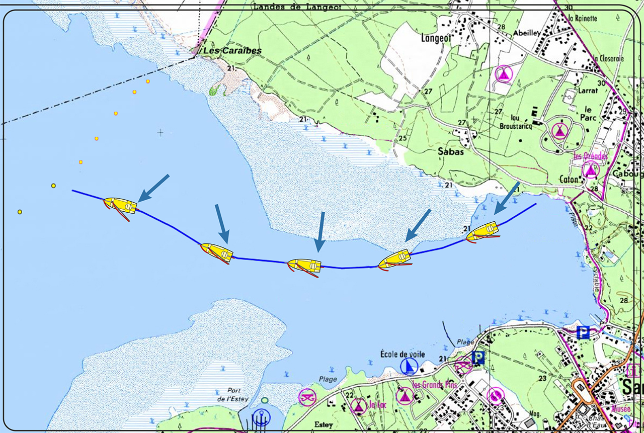 Voilà que le vent se stabilise Nord-Est alors que l’on parvient à la limite de la Zone. Ça ferraille au canon de 27, comme on disait sur la Somme en 1916. Il s’agit de tirs sol-air dont les bruits nous parviennent depuis le stand de tir situé en bord de mer, entre le Pyla et Biscarrosse.