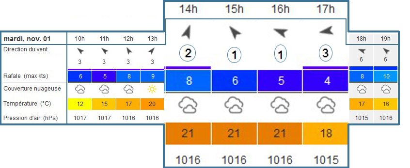 Pendant ce début de parcours au vent arrière, le vent se cherche. Il peut passer de Nord-Est à plein Nord et même à Nord-Ouest !